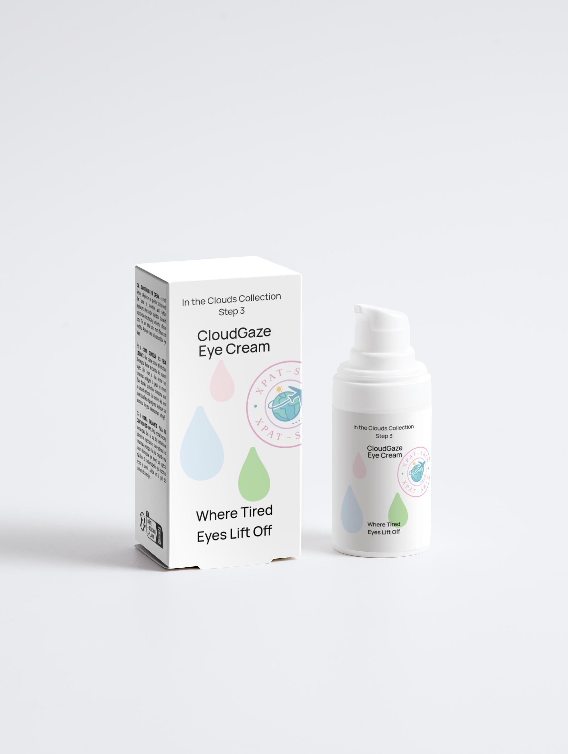 Step 3 in the In the Clouds Collection Bright eyes, soft focus. CloudGaze is a gentle botanical eye cream formulated to hydrate, de-puff, and brighten the delicate under-eye area. Powered by rice bran, ginkgo, horse chestnut, and grape leaf extract, it supports microcirculation, reduces puffiness, and softens fine lines—without irritating sensitive skin. Perfect for de-puffing during travel and high altitudes. Its lightweight texture absorbs quickly, delivering cloud-soft moisture and a visibly refreshed gaze. Ideal for dry, tired, or travel-stressed eyes.